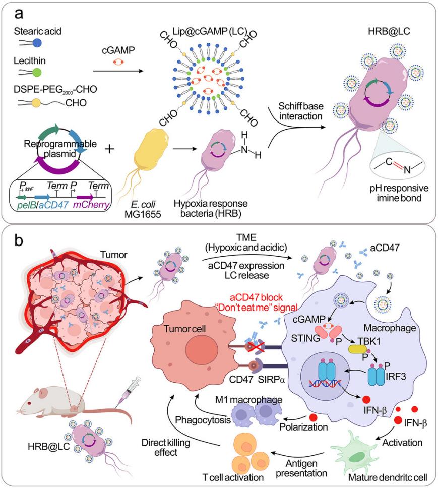 针对上述关键科学问题,研究团队基于合成生物学与材料工程学交叉融合技术,设计并构建“工程菌原位合成-脂质体靶向递送”协同治疗策略。以减毒大肠杆菌MG1655为宿主载体,将含缺氧启动子fdhF(PfdhF)及pelB-CD47抗体(aCD47)编码序列的可重编程质粒定向转入宿主菌,成功构建缺氧响应型工程菌(HRB),该工程菌可在肿瘤组织缺氧微环境中特异性启动aCD47的表达与分泌;同时,采用薄膜水合法制备负载STING激动剂cGAMP的pH响应性脂质体(LC),其亲水内核可高效包裹cGAMP,表面修饰醛基官能团后,通过席夫碱反应与HRB表面氨基实现共价结合,最终构建形成HRB@LC复合系统。该复合系统通过双重微环境响应机制实现肿瘤精准治疗:HRB响应肿瘤组织缺氧微环境,特异性表达并分泌aCD47,高效阻断CD47-SIRPα信号通路介导的肿瘤免疫逃逸;LC响应肿瘤局部弱酸性微环境,从HRB表面解离脱落,被巨噬细胞吞噬后定向释放cGAMP,激活STING信号通路,进而协同诱导巨噬细胞M1型极化、树突状细胞成熟及细胞毒性T细胞浸润与活化。