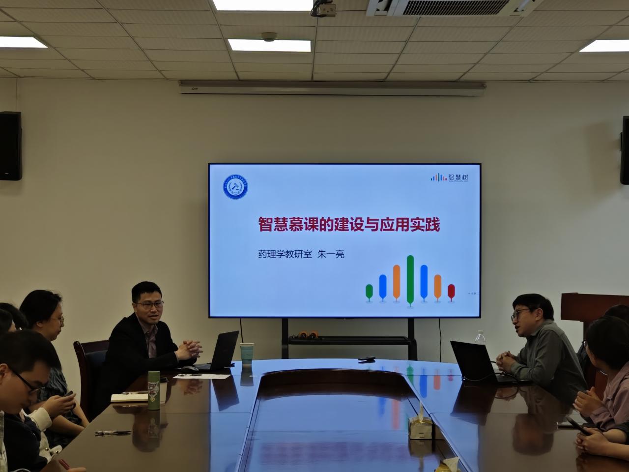 在教学应用分享环节,朱一亮老师重点展示了智慧慕课在课前、课中、课后三个阶段全场景进行 AI 赋能的当前实践,还展示了《药理学》智慧慕课的建设成果,包括知识图谱、“数智化”教学资源、AI智能体与跨校数据共享等,为学院教师尤其是新教师进一步开展课程建设提供了直观参考和有益经验。